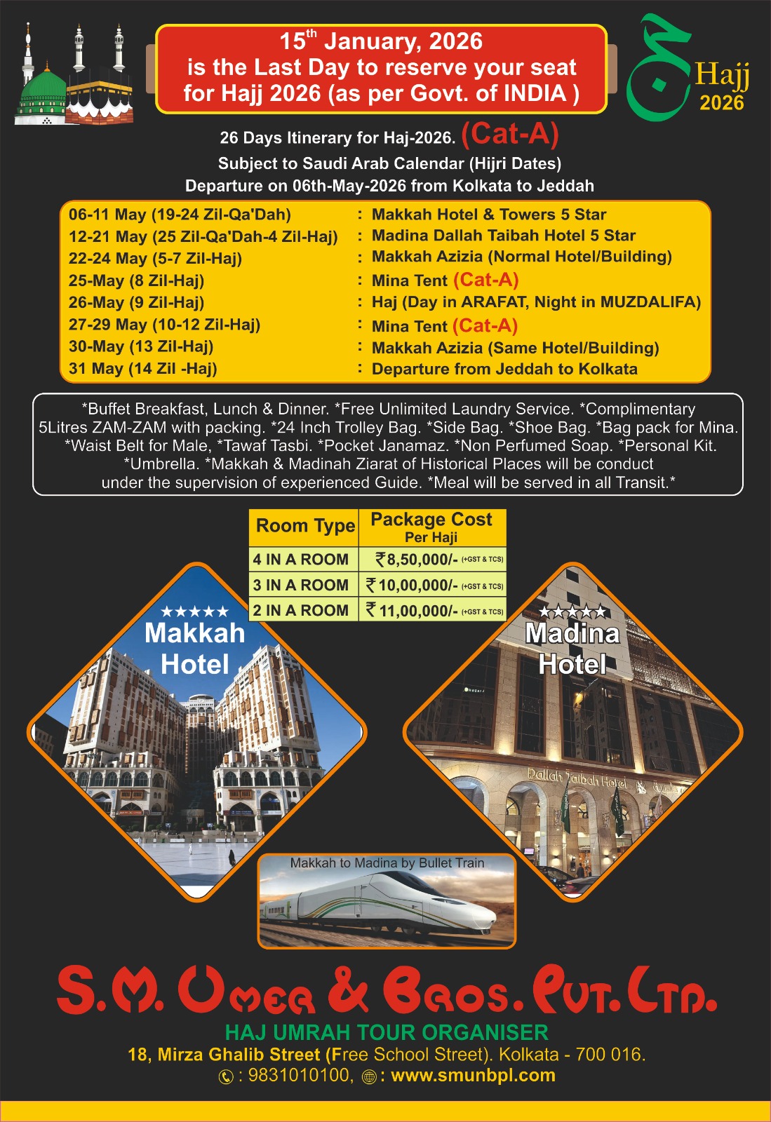 S.M. Umer & Bros. Pvt. Ltd. your trusted partner in fulfilling the sacred journey of Haj. Nestled in the heart of Kolkata, we take immense pride in being one of the leading Haj Tour Organizers in India, dedicated to providing a seamless pilgrimage experience for our esteemed clients.